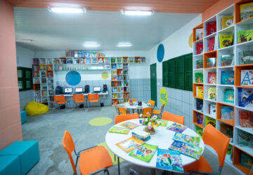 As bibliotecas ganharam novas cores, móveis projetados, computadores, TV, climatização, livros e jogos educativo-culturais. A biblioteca escolar é uma das