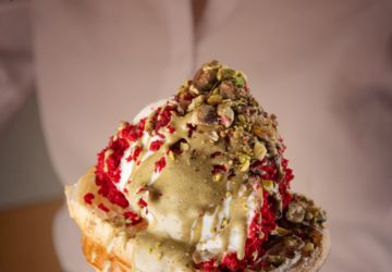 Novidade no cardápio , o Ice Crone, une croissant fresco, gelato, calda e mix de pistache ou castanha para uma