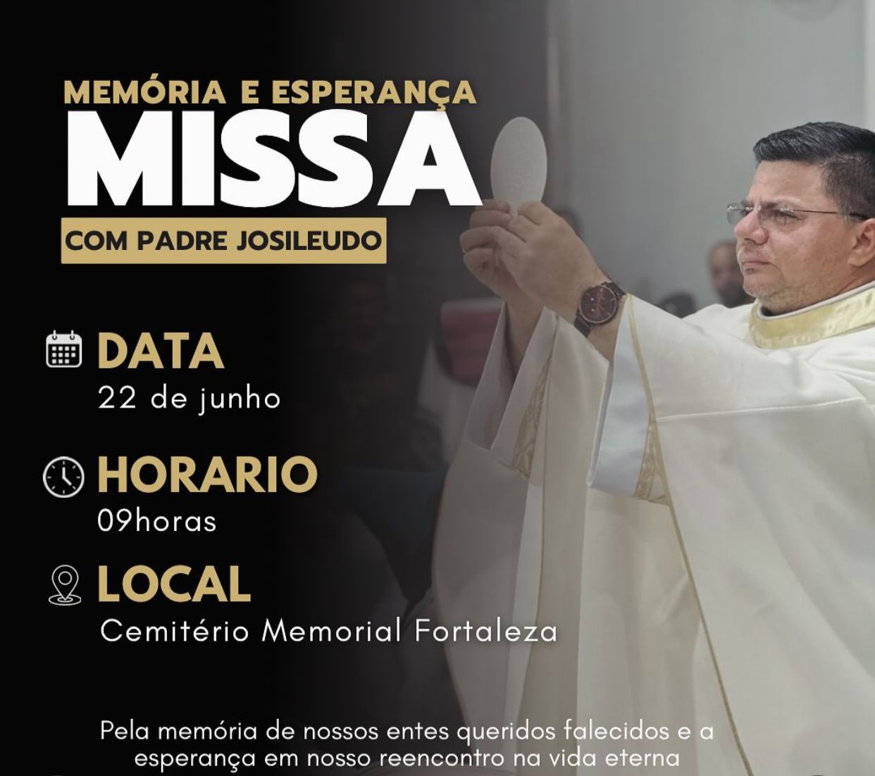 No dia 22 de junho, o Cemitério Memorial Fortaleza, empresa da Rede Memorial, promoverá uma missa da saudade, em memória aos entes queridos que já partiram. A cerimônia, que será celebrada pelo Padre Josileudo Queiroz, acontecerá na capela do Memorial Fortaleza, em Maracanaú. Após o momento de celebrações, acontecerá mais uma edição do GAER, evento de partilha, escuta e orientações emocionais, conduzido pela psicanalista e vice-presidente do Instituto Revoar, Elaine de Tomy. “Mesmo com a partida, a vida de quem se vai sempre continuará sendo importante para nossa jornada. Com o objetivo de honrar a memória e ensinamentos de nossos entes queridos falecidos, a missa busca fortalecer a esperança de reencontro na vida eterna”, declara Patrícia Meireles, diretora da Rede Memorial Fortaleza.