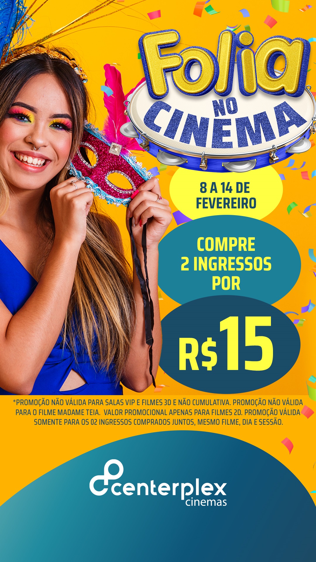 É importante ressaltar que a promoção não cobre as salas VIP e filmes 3D. A promoção “Folia no Cinema” é válida apenas para os filmes 2D e também não é cumulativa com outras ofertas ou descontos. Vale salientar que a oferta também não é válida para o filme “Madame Teia”.