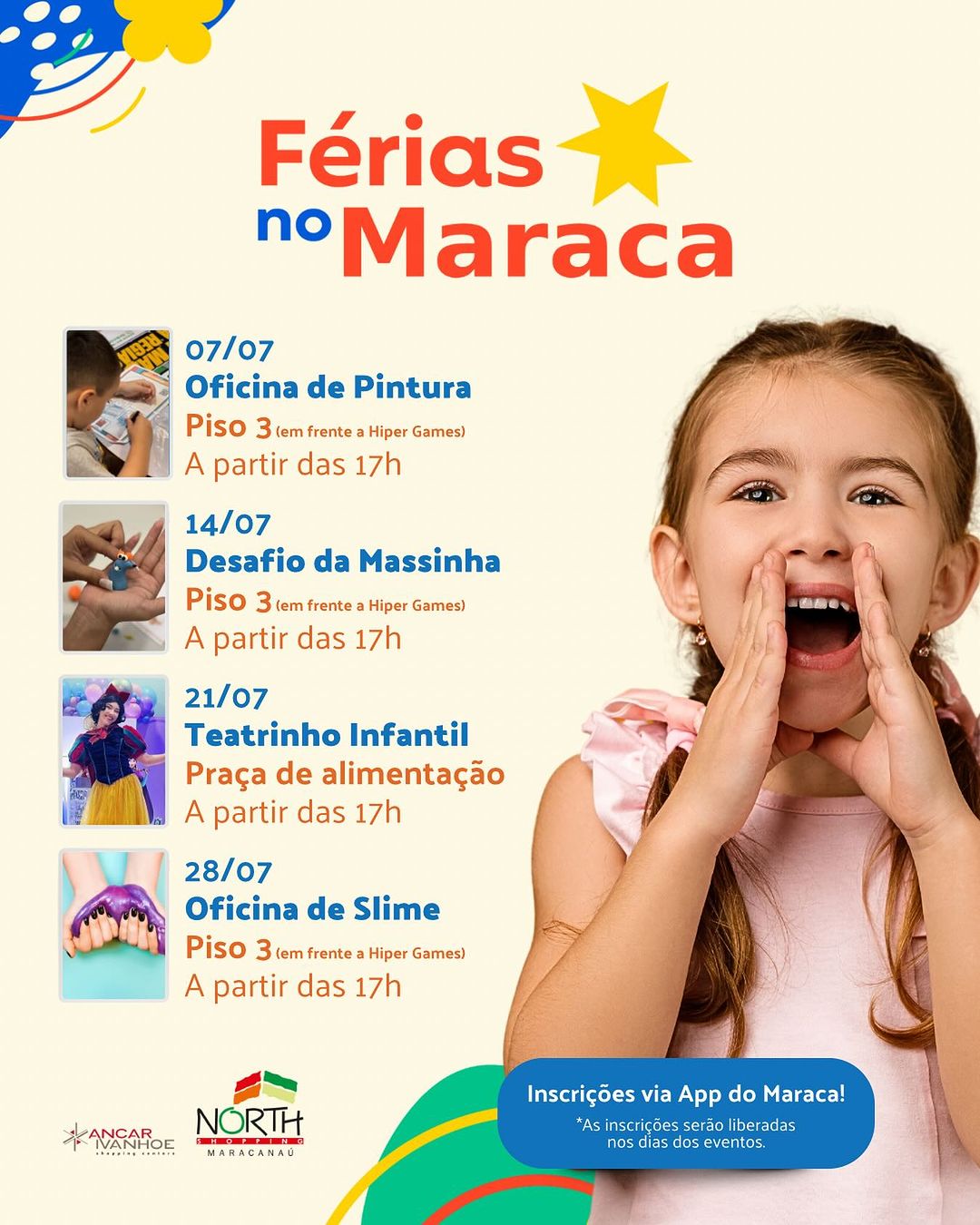 28/07 – Oficina de Slime: Muita diversão com pintura para a criançada Local: Lounge Maraca. Local: Piso 3, em frente a Hiper Games.